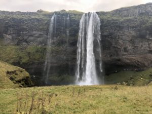 Seljalandsfoss – stunning series of falls just coming right off the mountain. You can walk behind this waterfall if you like. There are 5 falls at this location, so you can park (and pay) and then walk the trail to see them all.
