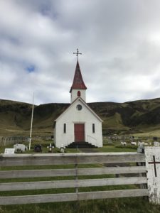 Vik – a small, coastal fishing village. Take the road up past the church on the hill to the cemetery and you will get a stunning view of the beach, water, towering cliffs and town.